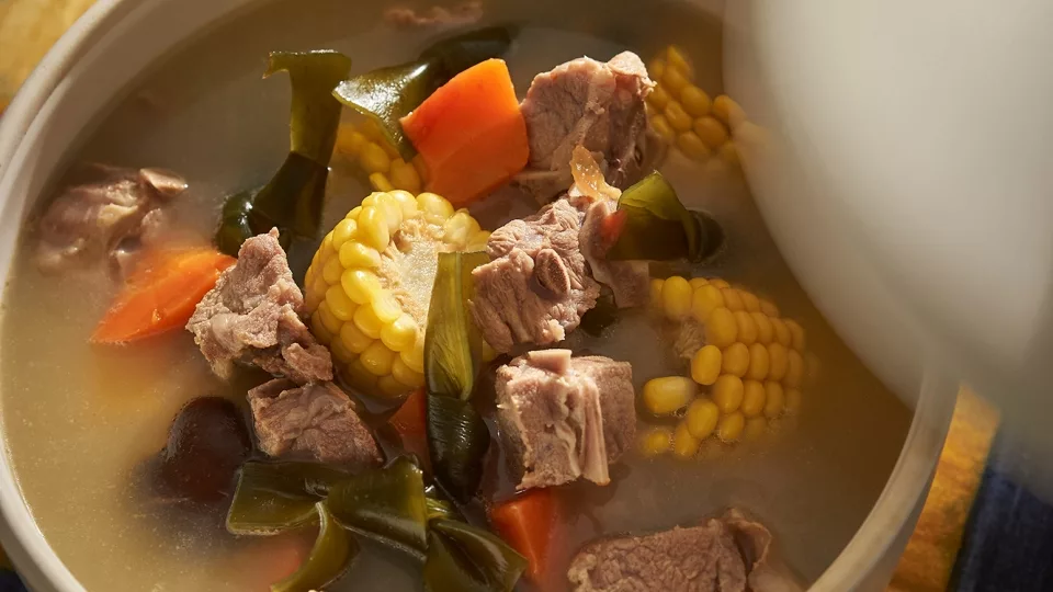 3.????? 鍋中水煮沸,放入豬湯骨,白蘿蔔,先煮20分鐘在入香菇,玉米,番茄,海帶節續煮10分鐘,加鹽調味。